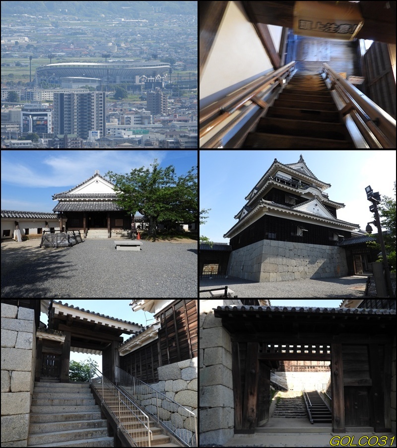 天守、小天守、隅櫓を渡櫓で結んだ連立式天守と登り石垣が特徴で標高132mの城山山頂にあり360度の眺望が開けている。