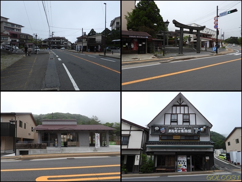 上段左:駐車場、下段:温泉神社に温泉たまご