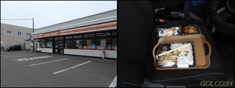 19:43 標津のセイコーマートでポテトコロッケ(128円)、炭火ピリ辛弁当(378円)、クッキー&クリームサンド(145円)を税込703円で購入。