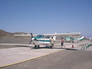 とはいいつつ話を聞くと6人乗りのセスナで後一人だけ乗客を探しているとのことだ、そしてナスカだけでなく、もう一つのパルパ(ナスカの北の町にまた別の地上絵がある)も含めて55分のフライトで40ドルでいいと破格だ!(ガイドブックには85ドルとかいてあったが)
