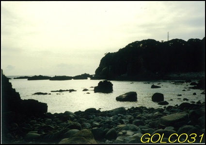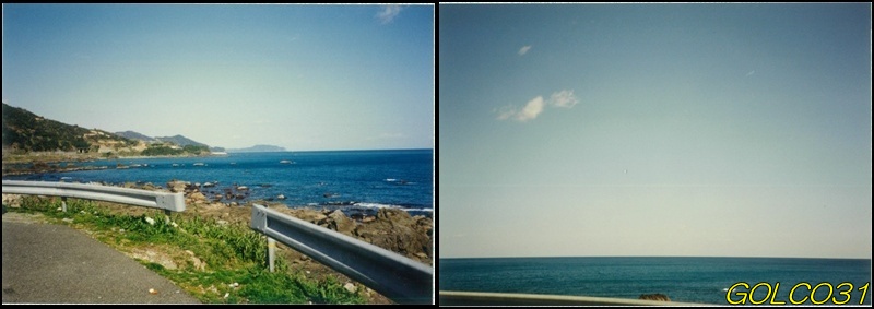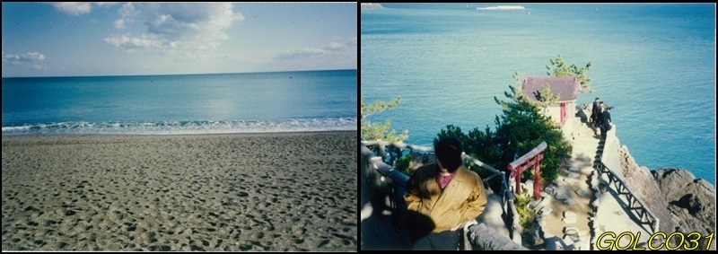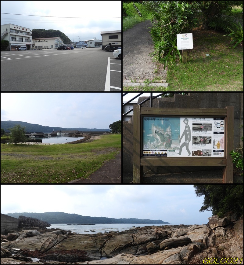 竜串海岸、駐車場から。上段右は足摺海底館。