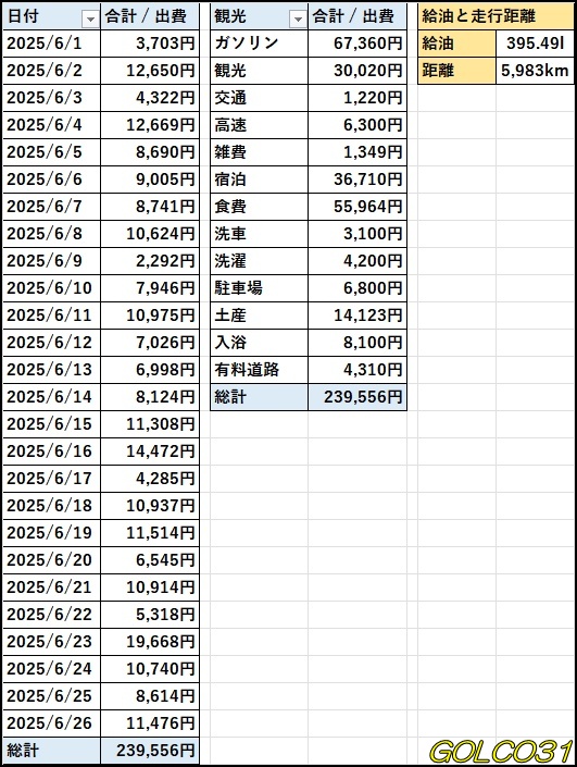 参考、日別と項目別の出費は下記。