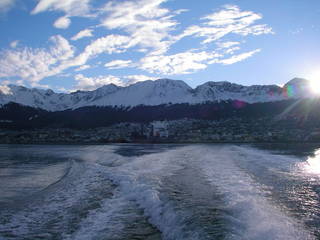 クルーズの小型船と出発してから見たウシュアイアの全景。